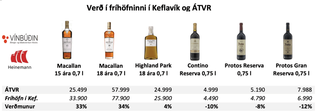 Á myndinni að ofan eru líka þrjú dæmi um rauðvín, sem eru aðeins 8-12% ódýrari í fríhöfninni í Keflavík en í Vínbúðinni. Vörur í fríhöfninni, eða Ísland Duty Free, eins og verslanirnar kallast eftir að Heinemann tók við rekstrinum, bera ekki virðisaukaskatt og einungis fjórðung áfengisgjalds, eins og áður segir. Verðmunurinn nemur hins vegar eingöngu u.þ.b. virðisaukaskattinum, sem er 11% á áfengi. Álagning Heinemann étur upp allan afsláttinn af áfengisgjaldinu.