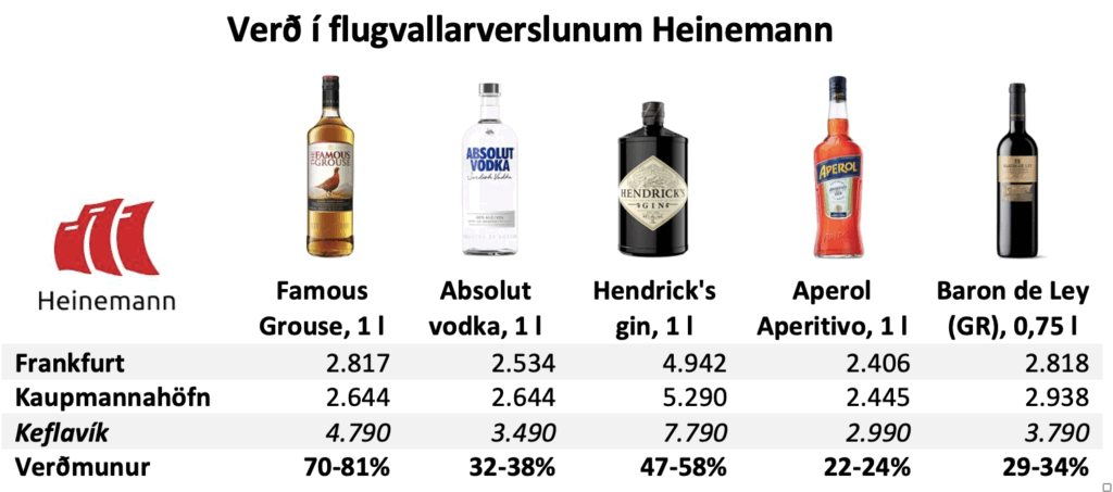Mörg dæmi eru um að áfengir drykkir séu miklu dýrari í fríhafnarverslun Heinemann á Keflavíkurflugvelli en í verslunum sama fyrirtækis á flugvöllum í öðrum Evrópuríkjum. Á myndinni hér að neðan, þar sem borið er saman verð á nokkrum vinsælum áfengistegundum í verslunum Heinemann á Keflavíkurflugvelli, Kaupmannahafnarflugvelli og Frankfurtflugvelli, sést að á Íslandi er áfengið 22-81% dýrara. Verðið er í öllum tilvikum fengið af vef viðkomandi verslunar.