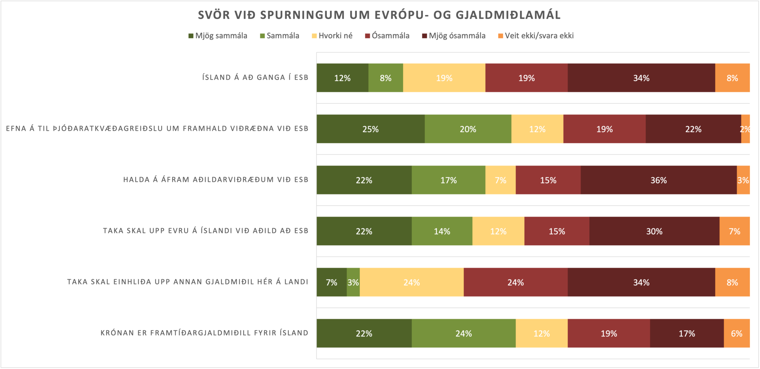 Þeir sem segjast sammála eða mjög sammála þeirri fullyrðingu að krónan sé framtíðargjaldmiðill fyrir Ísland eru 46%, en ósammála eða mjög ósammála eru 35%. Trú á krónunni hefur farið vaxandi; til samanburðar töldu 42% í könnun ársins 2019 að hún væri framtíðargjaldmiðill fyrir Ísland en ósammála því sögðust 47%. Hópurinn, sem er andvígur upptöku evru við aðild að ESB, hefur um árabil verið stærri en hinn sem er hlynntur upptöku. Þannig segjast 45% nú ósammála eða mjög ósammála því að taka eigi upp evru við aðild að ESB, en 36% segjast sammála eða mjög sammála. Hópurinn sem telur að taka eigi einhliða upp annan gjaldmiðil hefur frá upphafi verið lítill og þeir félagsmenn miklu fleiri sem eru andvígir einhliða upptöku.