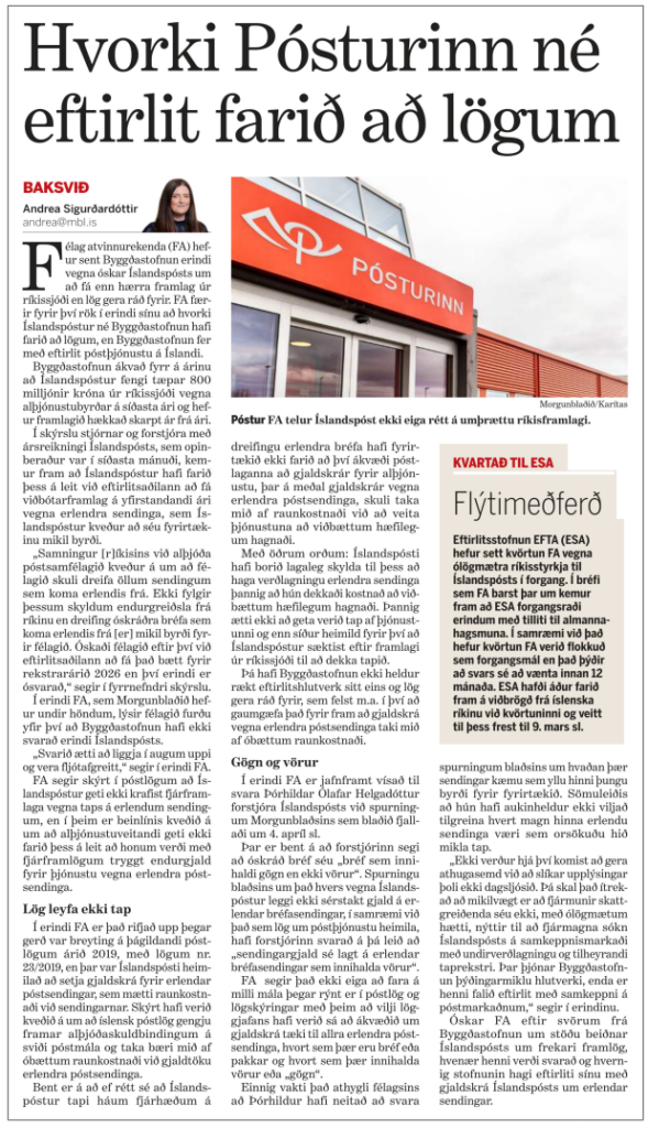 Morgunblaðið fjallar um erindi FA til Byggðastofnunar, vegna óskar Íslandspósts um að fá enn hærra framlag úr ríkissjóði en lög gera ráð fyrir. FA færir fyrir því rök í erindi sínu að hvorki Íslandspóstur né Byggðastofnun hafi farið að lögum, en Byggðastofnun fer með eftirlit póstþjónustu á Íslandi. Byggðastofnun ákvað fyrr á árinu að Íslandspóstur fengi tæpar 800 milljónir króna úr ríkissjóði vegna alþjónustubyrði á síðasta ári og hefur framlagið hækkað skarpt ár frá ári.